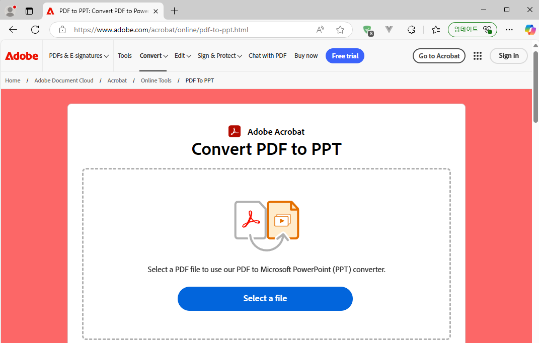 PDF를 PPT로 변환하는 방법은 아래 adobe 공식 사이트를 통해 처리할 수도 있고, 기타 여러 소프트웨어를 통해서도 변환이 가능하다.