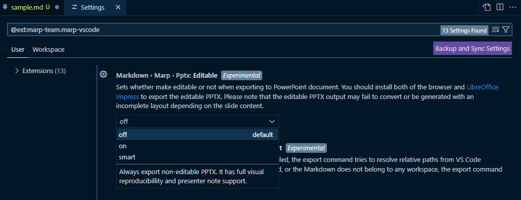아래 설정을 통해서 Editable을 on이나 smart로 바꾸면 편집가능한 PPT 파일이 생성된다는 것.