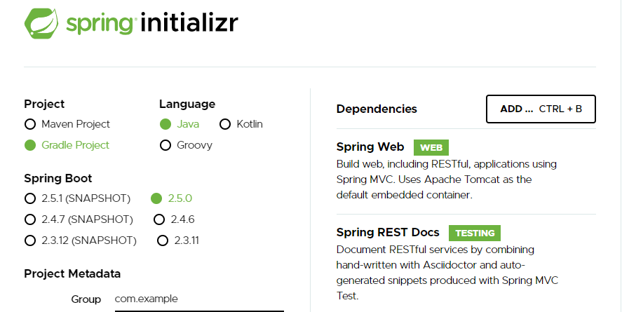 기존의 프로젝트에 Spring REST Docs를 추가하는 경우에도 Spring initializr 를 사용해서 Dependencies를 추가한 다음,