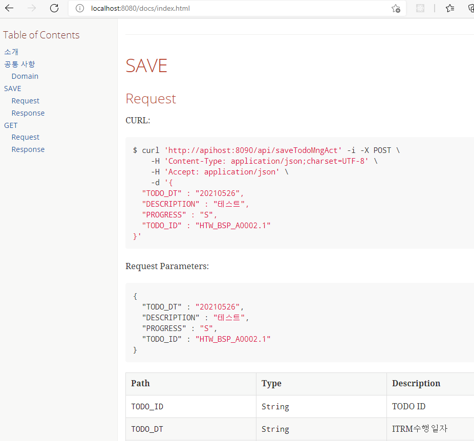 테스트 결과로 생성된 조각파일들을 include::{snippets}/itrm/save-todo-mng-act/curl-request.adoc[] 와 같은 식으로 문서내에 include 시켜서 사용한다는 것을 알 수 있습니다.