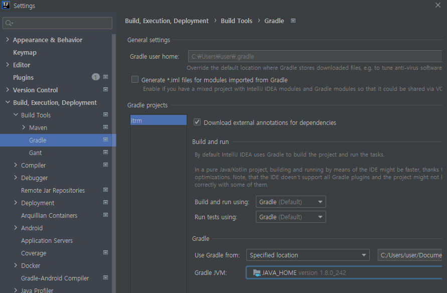 기존 프로젝트를 git에서 다운 받아 새로운 환경에 세팅하던 중 Intellij 에서 gradle프로젝트 빌드시
