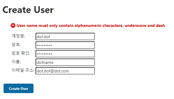 그 후, 다시 dot(.)을 포함한 사용자를 생성해보면 아래와 같이 정상적으로 생성되는 것을 확인 할 수 있다.
