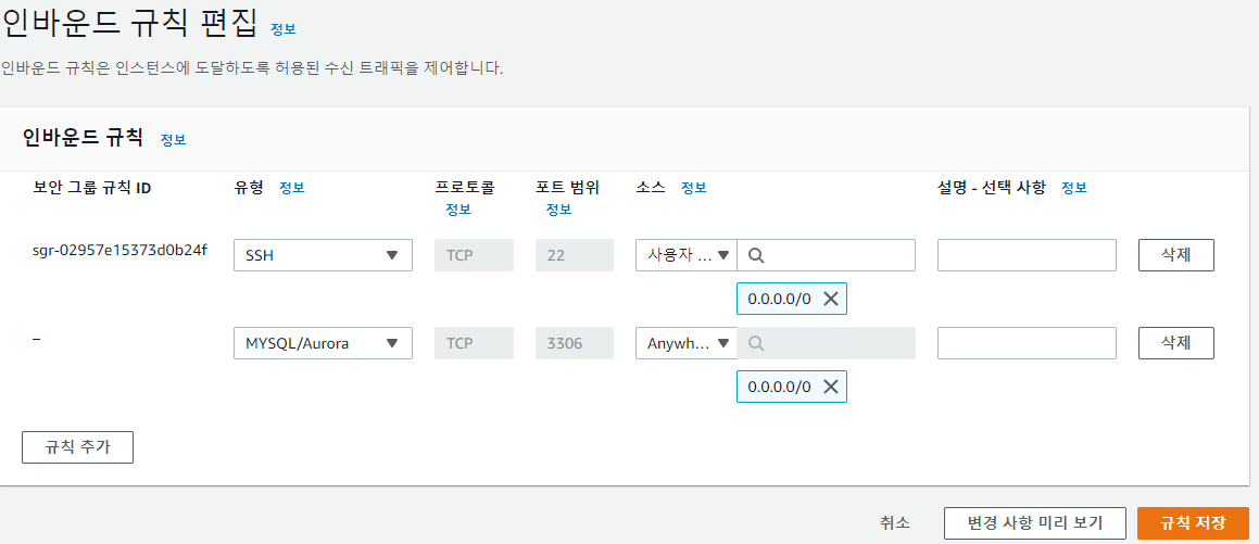 그리고 나서 EC2 > 보안그룹 > 인바운드 규칙에 3306 포트를 추가해 줍니다.