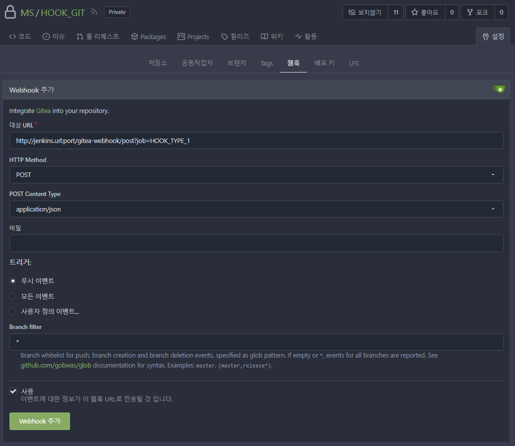 http://실제젠킨스URL/gitea-webhook/post?job=젠킨스Job이름