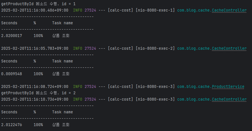 - 1번 상품에 대한 두번째 호출은 캐싱이 되어 응답시간이 줄어든 것을 확인할 수 있습니다.